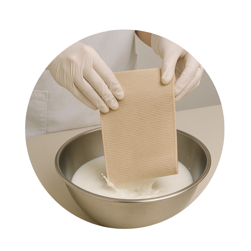 3. Aplicación del vendaje con la venda mojada con el producto en la zona deseada.
